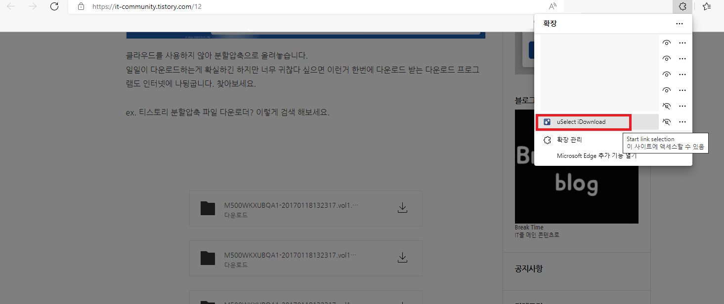5. 분할압축된 파일 페이지에서 확장 탭을 누르고 usselect idownload를 누르면 화면에 변화가 생깁니다.