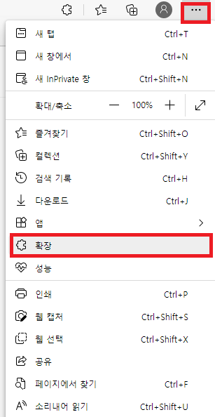 1. 먼저 우측 상단에 점 3개를 누르고 확장을 눌러주세요.