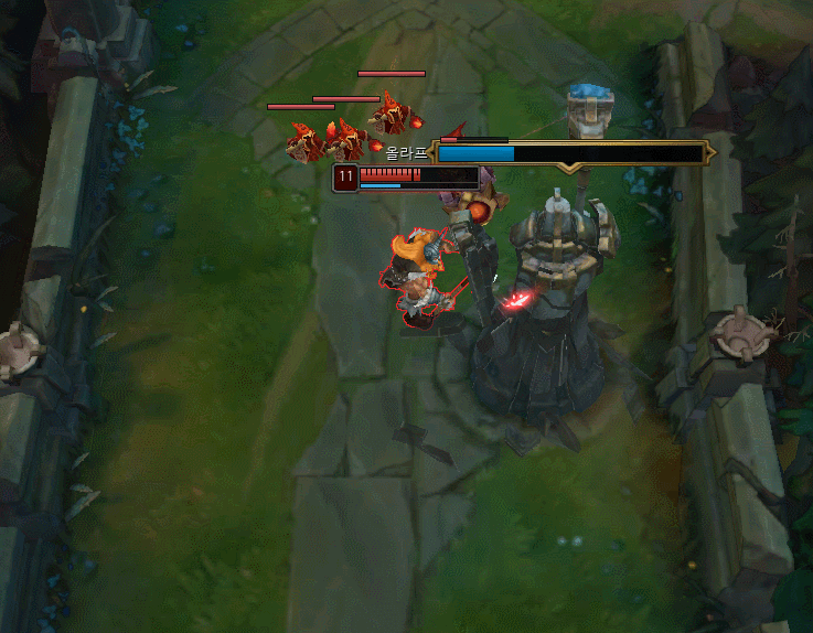 이후 미드나 바텀에 가지말고 탑라인의 2차 포탑을 부수면서 상대 탑과 더 확실한 차이를 벌려주세요. 이게 제가 생각하는 올라프의 기본입니다.