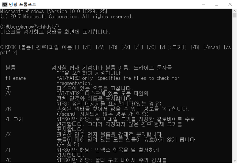 명령어 사용 방법이 궁금하면 chkdsk/? 입력 후 엔터키를 눌러주면 됩니다.