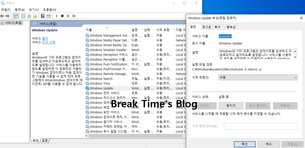 3. 시작 유형을 '수동'으로 변경하고, '중지' 버튼을 클릭해서 'Windows Update' 서비스를 중지한다.