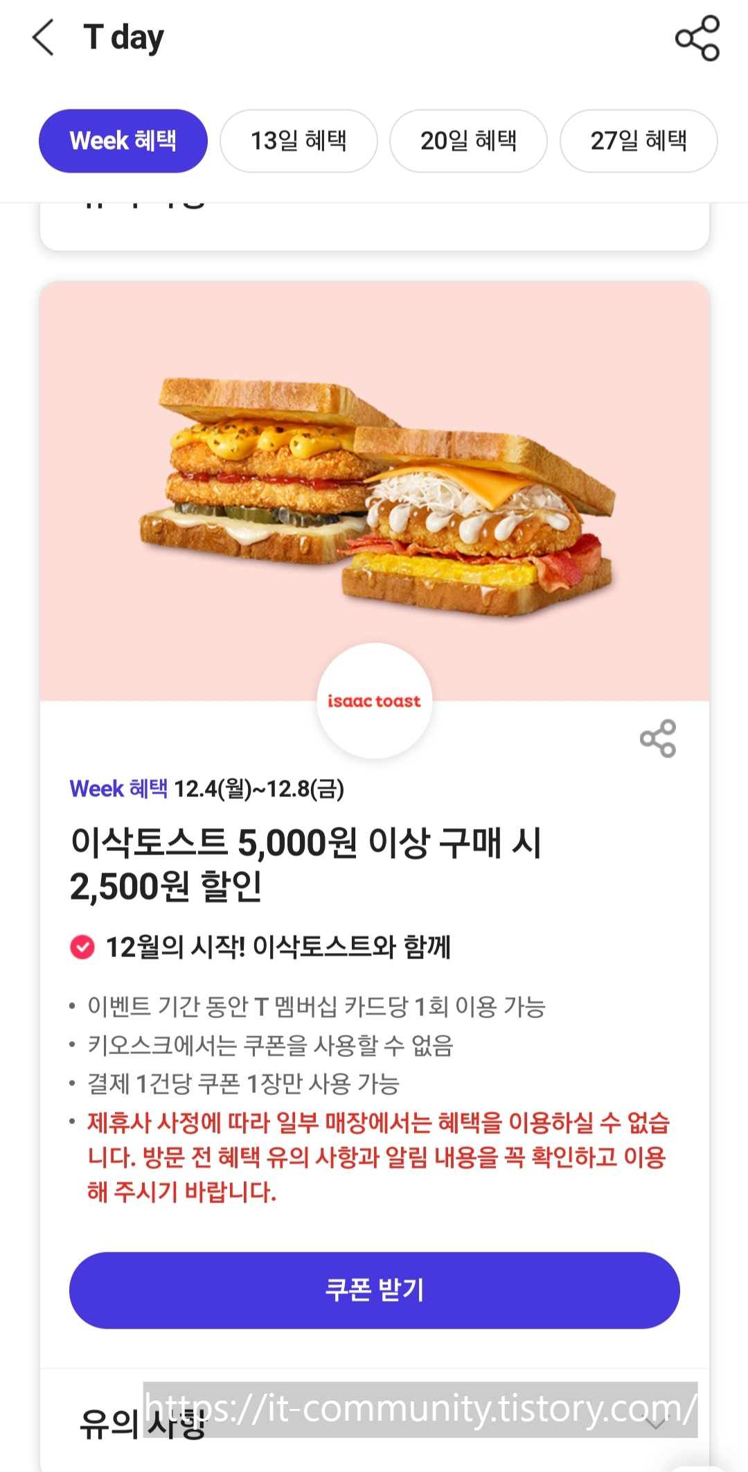 이삭토스트 T멤버십 12월 T-Day 할인 5000원 이상 구매 시, 2500원 할인 혜택 쿠폰을 사용했습니다. 기간은 12.4~12.8(오늘까지)