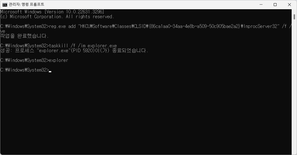 이러면 끝이다. 하지만 윈도우11 원래 환경으로 되돌려놓고 싶은 사용자를 위해 그대로 cmd에서 복사하면 원래대로 돌아오는 명령어도 남겨둡니다.