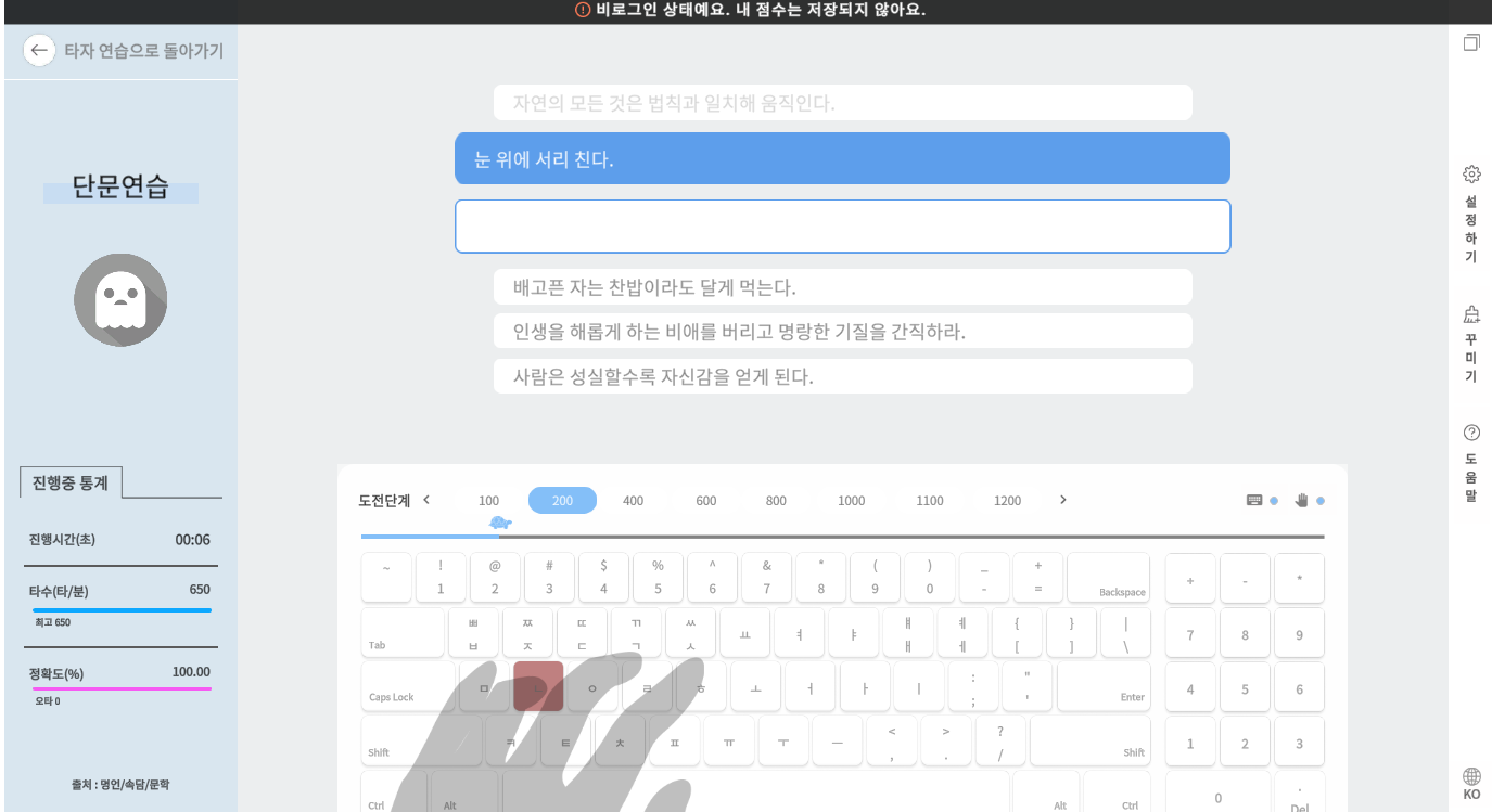 한컴타자 2007, 한컴타자 2010과 같이 프로그램에서 더 이상 프로그램으로는 없고 아예 사이트에서 타자 연습 기능을 제공하고 있습니다. 타자에 익숙하지 않은 아이들을 대상으로 좋을 것 같네요.