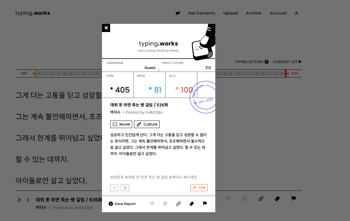 문학 작품, 소설 등의 짧은 글을 타이핑해볼 수 있습니다. 타닥타닥 소리나는 효과음도, 지우는 소리도 저에게는 좋더라고요.