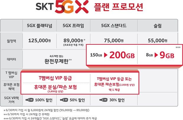 최저가 5G 요금제인 ‘슬림’ 요금제도 기본 제공데이터 8GB에 1GB를 추가로 제공합니다. 오는 6월 말까지 ‘5GX 플래티넘’, ‘5GX 프라임’ 요금제에 가입한 이용자는 속도 제한 없이 무제한 데이터를 이용할 수 있습니다.