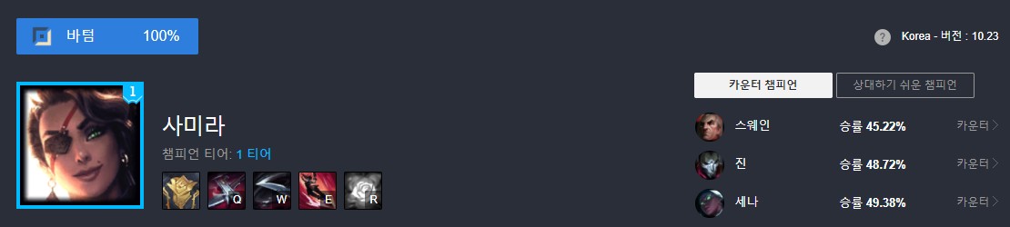 원딜 사미라는 시즌11에 1티어 위치중입니다.