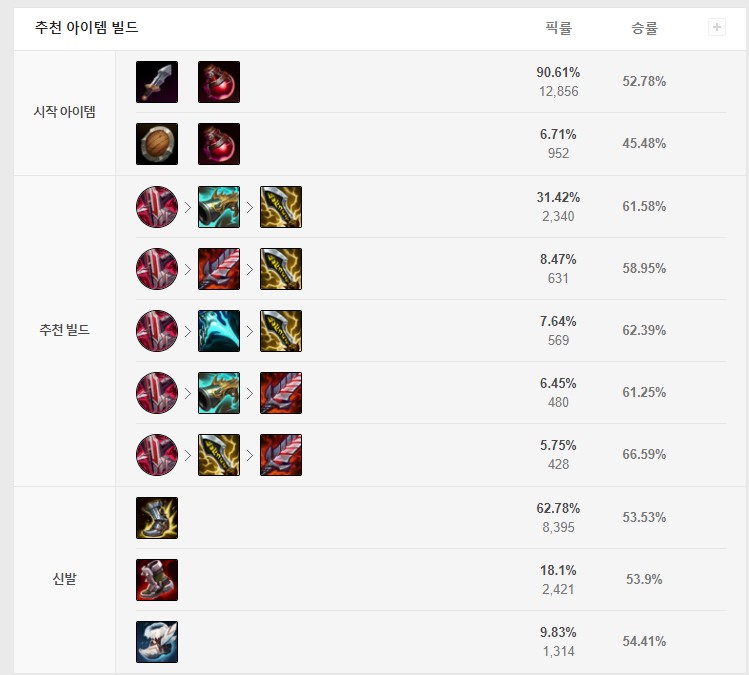 AD 신화급템들이랑 시너지가 오져서 좀비 원딜로 군림하고 벤픽 1위를 달성하고 있습니다.